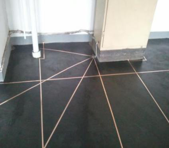 施工工藝 A.素地處理 B.涂刷環氧防靜電底漆 C.鋪設導電銅箔網,設置接地導線 D.批刮環氧防靜電砂漿層 E.打磨砂漿層并清潔 F.批刮環氧防靜電膩子層 G.滾涂環氧防靜電面漆(半啞光)